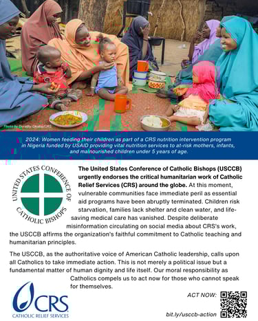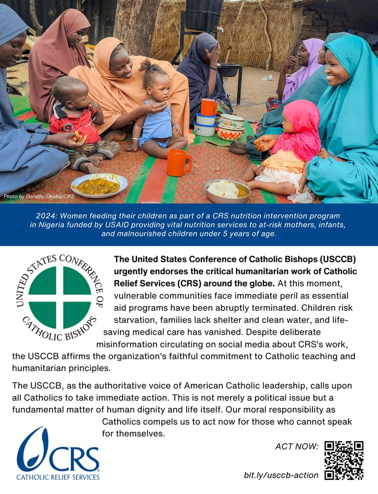The United States Conference of Catholic Bishops (USCCB) urgently endorses the critical humanitarian work of Catholic Relief Services around the globe. At this moment, vulnerable communities face immediate peril as essential aid programs have been abruptly terminated. Children risk starvation, families lack shelter and clean water, and life-saving medical care has vanished.